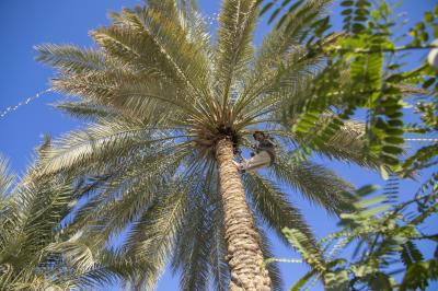 وأضاف: "أنّ هذا النخيل يتمّ الاهتمام به من حيث توفير الماء اللازم للسقي والأسمدة العضويّة والأسمدة الكيميائيّة بأنواعها ومحفّزات النموّ وغيرها، إضافةً إلى وضع برنامجٍ سنويّ لخدمته يتكوّن من أربع مراحل، تُعتلى فيها النخلة مرّة للتلقيح وأخرى لتدلية الثمار وثالثة لقطف الثمار وقصّها، والرابعة هي التي نقوم بها حاليّاً والتي تكون ممهّدةً لما يتبعها من أعمال تخصّها".