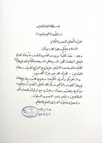 We have received with more sorrow and regret the news of the death of the great scholar; Sayed. Ali Al-Sayyid Abd Al-Hakim Al-Safi, who has spent his honorable life promoting true religion and caring for the believers. May God reward him with the best reward.