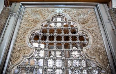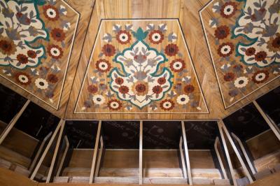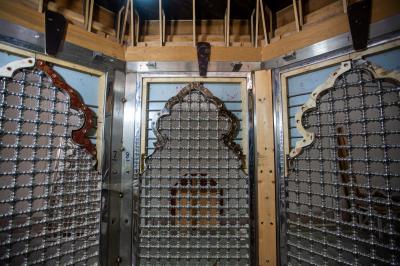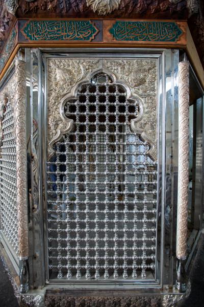 Il a poursuivi: «Après avoir terminé toutes les boiseries de la grille de l'intérieur, on a commencé à teindre les parties à teindre, en fonction de la couleur et de l'emplacement de chaque partie, en plus de préparer la peinture de l'écrit poétique et coranique. bandes avec de l'émail et de l'eau d'or, en plus de la frise décorative en laque (rein) qui surmonte la phalange poétique et entoure les huit parties de la grille, et chaque partie a une fleur décorative au milieu (tura), et de chaque côté se trouve une pièce décorative qui relie chaque partie de celui-ci à l'autre et en fait une seule pièce.