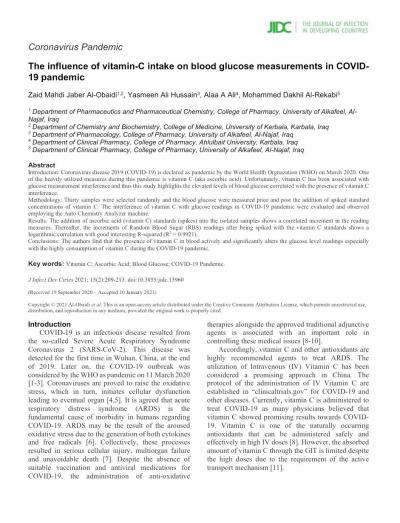 Une équipe de recherche du Collège de pharmacie de l'Université Al-Kafeel a réussi à trouver une relation entre les lectures du diabète pendant la pandémie Corona, grâce à leurs recherches publiées dans l'une des revues internationales italiennes classées dans les conteneurs de Scopas et Clarifit, En outre, il a été publié sur (PubMed), dont les résultats scientifiques et pratiques ont indiqué que la présence de vitamine C dans le sang modifie les lectures du taux de glucose de manière efficace et significative, en particulier avec la consommation élevée de vitamine (C) pendant le COVID- 19 pandémie.