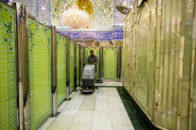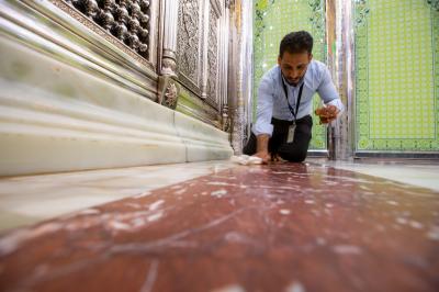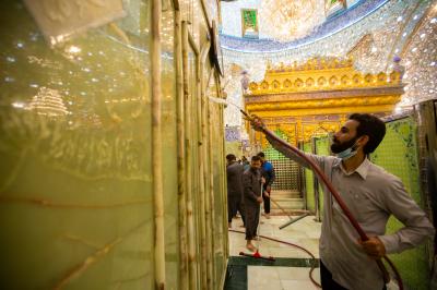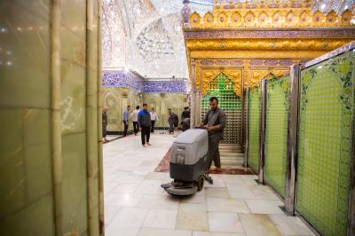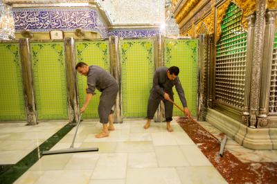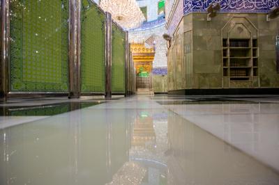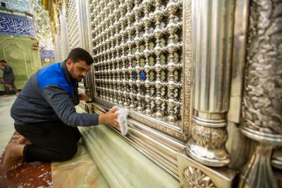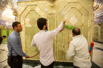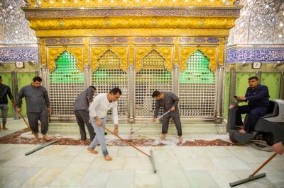 وأضاف: "أنّ هذه الأعمال أُجريت ليلاً بعد انقطاع حركة الزائرين، حيث تمّ إغلاق الحرم الطاهر وقمنا برفع السجّاد القديم، من ثمّ إجراء أعمال الغسل التي شملت الأرضيّة بدءاً من الشبّاك الشريف وصولاً إلى الطارمة، مروراً بأروقته الأربعة المحيطة به، هذا بالإضافة إلى الجدران وباستخدام موادّ تنظيف خاصّة".