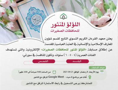 أوّلاً: مسابقة اللؤلؤ المنثور: وهي مسابقةٌ للحافظات الصغار وستُجرى بطريقةٍ إلكترونيّة عبر منصّة (GOOGL MEET) وفق المعطيات ورابط الدخول هو: https://meet.google.com/pdu-iycd-uyj ، وستنطلق يوم الأربعاء الثامن من شهر رمضان المبارك، للفئات العمريّة من السنة الرابعة حتّى السادسة، وستكون المنافسة في سورتَيْ البلد والشمس.