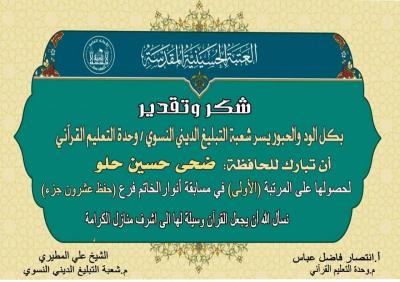 ضحى حسين حلو، قرآن آموز مرکز القرآن الکریم آستان قدس عباسی توانست در این مسابقه از دیگر حافظان شرکت کننده عراقی و خارجی در مسابقه حفظ بیست جزء برتری یابد.