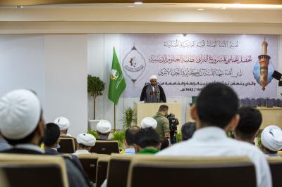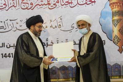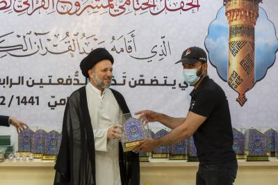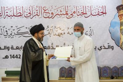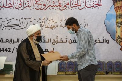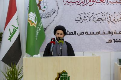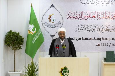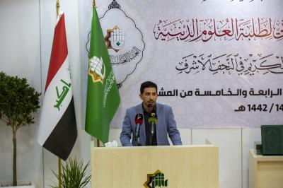 Danach gab es eine Begrüßungsrede des Präsidenten der Wissenschaftlichen Akademie des Edlen Koran im Heiligen Abbassitischen Schrein, Dr. Ahmed Sheikh Ali, in der er sagte: "Sie sind herzlich eingeladen, mit uns den Abschluss einer Gruppe von Studenten dieses Projekts zu feiern, die einerseits die Rechtswissenschaften mit den Wissenschaften, den Urteilen und der Rezitation des Koran verbinden. Auf der anderen Seite übersetzen sie die Realität der Wechselbeziehung zwischen diesen Wissenschaften, die untrennbar mit dem Heiligen Koran verbunden sind.