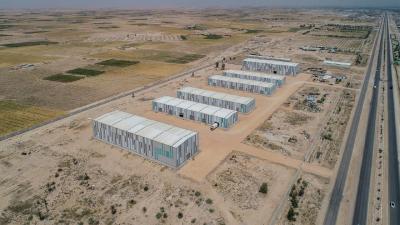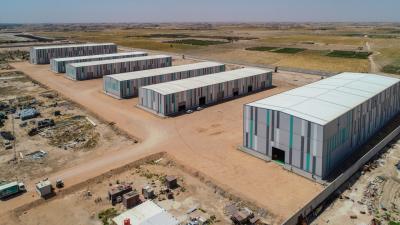 Er wies darauf hin: "Es gibt vier Lagerhallen mit einer Fläche von jeweils 2.500 m2. Das Projekt besteht aus einer überdachten Struktur, die auf Fundamenten und Betonsäulen mit einer Höhe von (9,5 m) basiert, wobei spezielle Formen verwendet wurden, die innerhalb des Arbeitsplans fertiggestellt wurden. Die Decke besteht aus hohlen Eisenrohren, die sich durch Leichtigkeit und Steifigkeit zugleich auszeichnen. Sie werden zu einer homogenen Masse aus Eisen zusammengefügt, die weite Räume schafft, ohne dass auf Mittelstützen zurückgegriffen werden muss, was bei solchen Projekten von Vorteil ist, da sie große Flächen benötigen. Bei diesem Projekt wurden moderne Technologien und Qualitätsmaterialien verwendet, die nach internationalen Spezifikationen zugelassen sind.