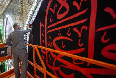 Signs of grief, such as condolence banners, were sewn, embroidered, and shaped in the sewing division of the Gifts and Vows Department at the al-Abbas's (p) holy shrine, after all the necessary measurements were taken for the entire area of the Sanctuary.
