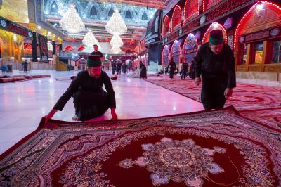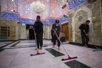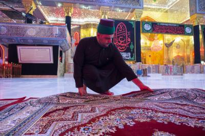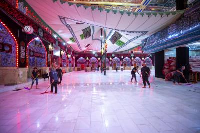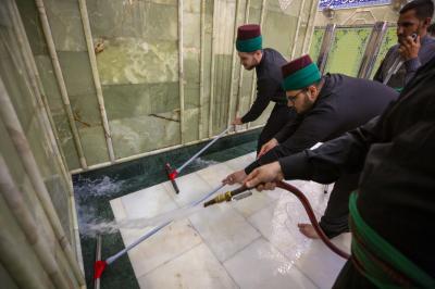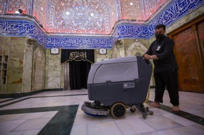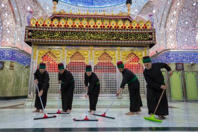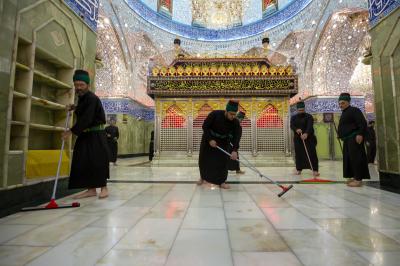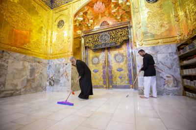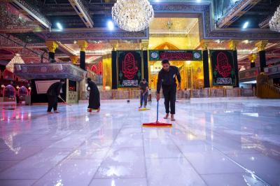 من جانبه أضاف مسؤولُ شعبة الحرم الحاج نزار غني خليل، أنّ: "الأعمال داخل الحرم المطهَّر شملت التنظيف والتعطير بدءاً من الشبّاك الشريف، وباستخدام موادّ خاصّة تساعد في المحافظة على بريقه، وانطلقنا بعد ذلك للمساحات المحيطة وصولاً الى أروقته الأربعة المحيطة به، حيث تمّ تنظيف الأرضيّة والجدران وتعقيمها، وذلك من أجل الحفاظ على بريقها ورونقها وإزالة أيّ عوالق فيها قد تؤثّر على شكلها، وقد استخدمنا موادّ خاصّة جمعت بين التنظيف والتعقيم لنقوم بعد ذلك بإعادة فرشه بالسجّاد المخصّص له".