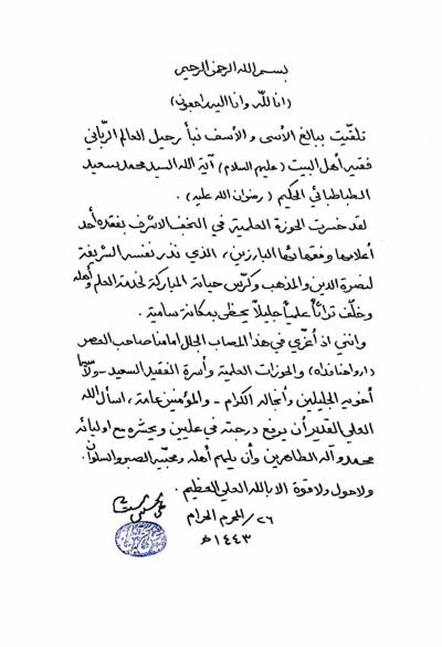Bu büyük musibet sebebiyle İmamımız Sahibulasr’a (Canlarımız O’na fedâ olsun), ilimler havzasına, başta pek değerli iki kardeşi ve saygın evlatları olmak üzere bahtı pek açık merhumun ailesine ve müminlere taziyelerimi sunarım. Bu taziyeyi sunarken aynı zamanda da Aliyy-i Kadîr olan (Her şeye gücü yeten, pek kudretli) Yüce Allah’tan merhumun derecelerini “illiyîn” makamına yükseltmesini, merhumu Yüce Allah’ın velîleri olan Hz. Muhammed ve Pâk Soyu ile beraber haşr eylemesini ve merhumun yakınlarına ve sevenlerine sabır ve teselli ilham buyurmasını niyaz ederim.