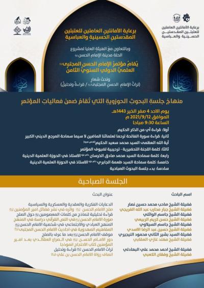 کمیٹی کی جانب سے بتایا گیا ہے کہ حوزوی تحقیقی سیشن کل صبح ، اتوار (4 صفر الخیر 1443 ہجری) بمطابق (12 ستمبر 2021 ء) کو بابل یونیورسٹی میں منعقد ہوگا اور اس سیشن کا آغاز اعلی دینی قیادت مرحوم آیت اللہ سید محمد سعید الحکیم (قدس سره) کے ایصال ثواب کے لئے سورۃ فاتحہ کی تلاوت سے ہو گا۔ اس کے بعد۔ نامور علمی شخصیات خطاب کریں گی۔ جس کے بعد تحقیقی سیشن شروع کیا جائے گا۔ حوزوی تحقیقی سیشن کے دوران 10تحقیقی مقالات پیش کئے جائیں گے۔