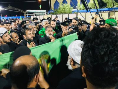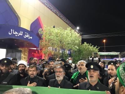 Die Delegation wurde von einer Reihe von Dienern des Razavi-Schreins vertreten, die die Übergabe des Banners mit der Rezitation einer Husseinitischen-Elegie begannen, deren Verse das Unglück von Imam Al-Hussein (Friede mit ihm) und das, was seiner Familie an solchen Tagen im Jahr 61 AH widerfuhr, besangen, und gleichzeitig den großartigen der Iraker bei ihrem Dienst gegenüber den Abaeen-Pilger von Imam Al-Hussein (Friede mit ihm), und wie sie das Wertvollste für die Ehre opferten, den Besuchern bei diesem gesegneten Besuch zu dienen, was die Tiefe der Verbindung zwischen ihnen und ihrer Inspiration und Imam Hussein (Friede mit ihm) zeigt.