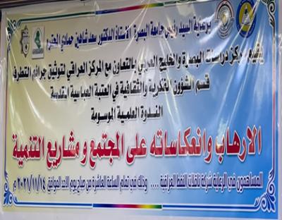 نَظَّمَ المركزُ العراقيُّ لتوثيقِ جرائمَ التطرّفِ التابعُ لقسمِ الشؤونِ الفكريَّةِ والثقافيَّةِ في العتبةِ العبَّاسيَّةِ المُقَدَّسَةِ وبالتعاونِ مع مركزِ دراساتِ البصرَةِ والخليجِ العربي في جامعةِ البصرةِ ندوةً كانَتْ بعنوان (الإرهابُ وانعكاساتُه على المجتمعِ ومشاريعَ التنميةِ) .