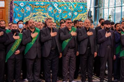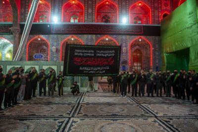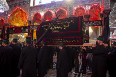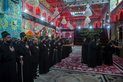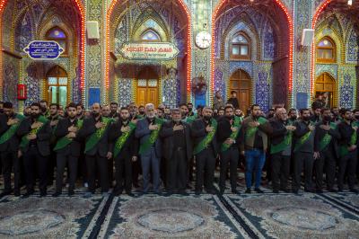 Kama kawaida matembezi ya kuomboleza yameanza baada ya Adhuhuri ya Jumamosi (13 Jamadal-Uula 1443h) sawa na tarehe: (18 Desemba 2021m), chini ya utaratibu wa mikusanyiko na matembezi uliowekwa katika haram ya Abulfadhil Abbasi (a.s), watumishi wamesimama kwa mistari na kutoa pole kwake kutokana na msiba huu, baada ya hapo walianza kutembea wakiongozwa na katibu mkuu wa Atabatu Abbasiyya Mhandisi Muhammad Ashiqari na wajumbe wa kamati kuu na marais wa vitengo, halafu wakaenda kwenye malalo ya Imamu Hussein (a.s), kwa kupitia katika uwanja wa katikati ya haram mbili tukufu, huku wakiimba kaswida na tenzi za kuomboleza, mazuwaru wa malalo mbili takatifu pia waliungana nao kwenye matembezi hayo.