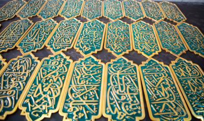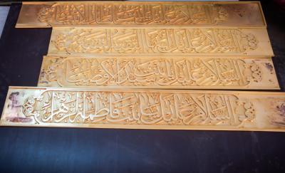 Le responsable du département, M. Nadhem al-Ghurabi, a déclaré à Al-Kafeel Network : « Une fois les bandes d'inscription terminées et temporairement fixées sur le cadre en bois de la grille, pour vérifier le degré de conformité de la mesure et de la conception, le travail de placage à l'or (24 carats avec une pureté de 999,9) a commencé. Le processus est effectué à l'aide d'un mécanisme moderne et avancé qui a prouvé son succès et son efficacité dans un certain nombre de grilles que notre département a réalisées.