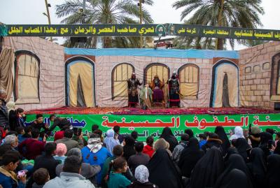 The theatrical work was held in coordination with the Department of Hussayni Rites and Processions and the Department between the Two Holy Shrines, and was presented by the Mobile Theater Troupe of the Hussayni Tofoof Organization in the Mdaynah District in the Basra Governorate, in the presence of a large number of visitors who gathered around the stage in the square.