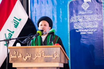 Es folgte die Rede des heiligen Abbassitischen Schreins, die von Scheich Adel al-Wakeel von der Abteilung für religiöse Angelegenheiten gehalten wurde, in der er über die Persönlichkeit der Heiligen az-Zahra (Friede mit ihr) und ihre Stellung und ihren Status bei Gott, dem Allmächtigen, und Seinem Gesandten und den Ahl al-Bayt (Gottes Friede mit ihnen) sprach, und wie sie zu jeder Zeit und an jedem Ort zu einer Quelle des Guten und des Segens wurde. Er sprach auch über ihre Beziehung zur Nacht des Erlasses [Laylat al-Qidr], deren Geheimnis nicht bekannt ist, und auch über az-Zahra (Gottes Frieden mit ihr), und dass alles, was über sie geschrieben wurde, ihr nicht gerecht wurde und ihre Geheimnisse nicht verstand. Al-Wakeel verwies auch auf Zitate aus ihrer duftenden Biographie und ihrer berühmten Fadak-Predigt mit hohem und erhabenem Inhalt.