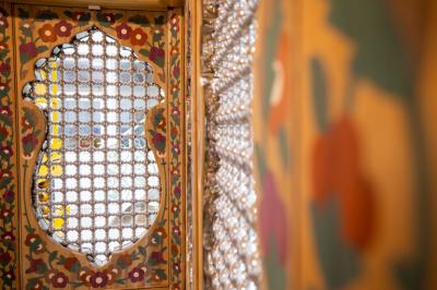 Akaongeza kuwa: “Kazi ya kuweka mapambo inafanywa kwa umakini mkubwa, kila kipande cha dirisha kinawekwa pambo la vyumba vya madirisha lenyo umbo la upinde, lenye urefu wa (sm 143), sehemu kubwa zaidi na upana wa (sm 80), sehemu yenye upana zaidi, sehemu ya juu inazungukwa na ufito wa pambo wenye maandishi, unaoshikiliwa na nguzo kuu za chini”.