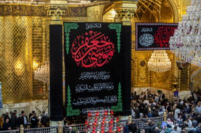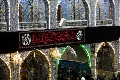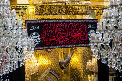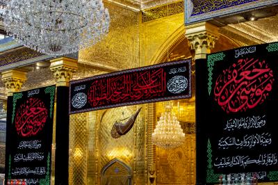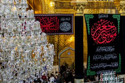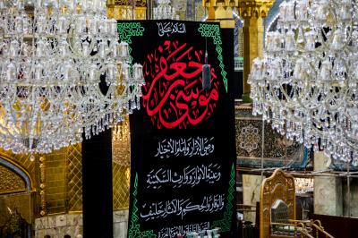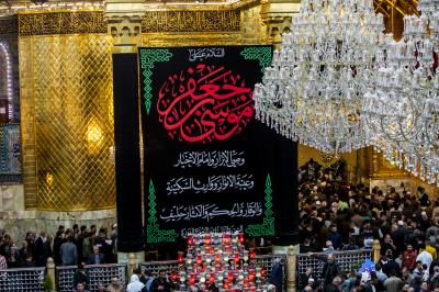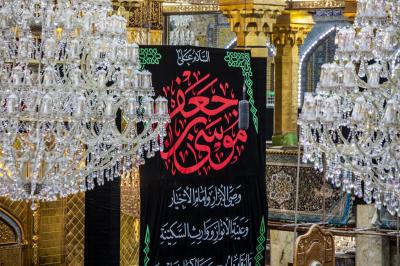 Die Zeichen der Trauer verbreiteten sich und ihre Manifestationen erschienen auf den Korridoren und Wänden des heiligen Abbassitischen Schreins und markierten die Ankündigung der Trauer für den Jahrestag des Martyriums des seltsamen vergifteten Imams Musa bin Jaafar Al-Kadhem -Friede mit ihm-, der auf den nächsten Sonntag, den 25. Rajab, fallen wird.