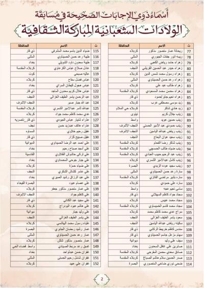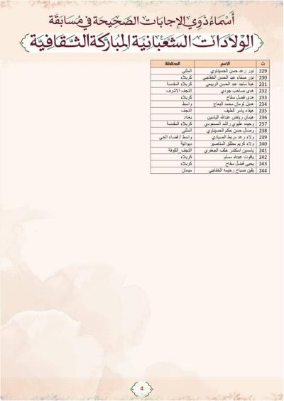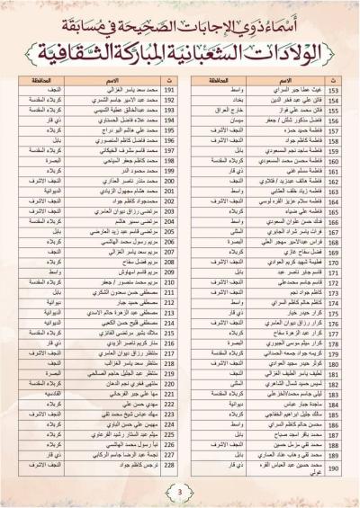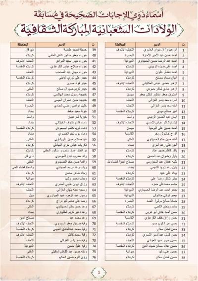 أعلنت اللّجنةُ المُشرِفة على مسابقة الولادات الشعبانيّة المباركة الثقافيّة، المُعَدّة من قسمَيْ الإعلام والشؤون الدينيّة في العتبة العبّاسية المقدّسة، عن أسماء ذوي الإجابات الصحيحة المرفقة بالصور في الخبر.