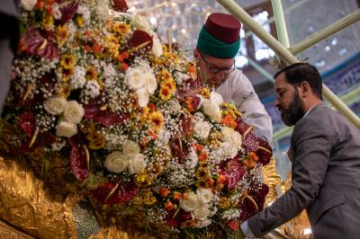 La grille du sanctuaire d'Aba al-Fadl al-Abbas (que la paix soit sur lui) a été décorée des plus belles couronnes naturelles, à l'occasion de l'anniversaire de la naissance de son frère aîné Imam al-Hassan al-Mujtaba (que la paix soit sur lui) , que nous célébrons demain, le quinzième du mois de Ramadhan, dans une atmosphère de joie et de bonheur accompagnée de chants et d'acclamations se réjouissant à cette occasion.