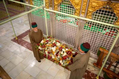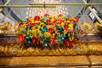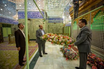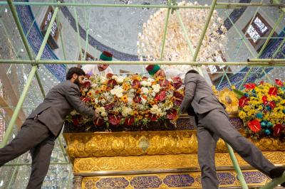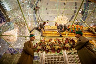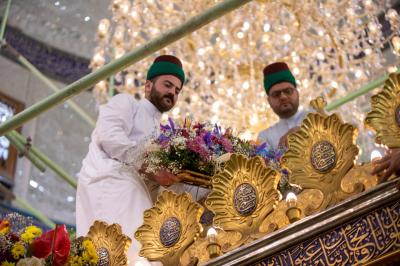 Le personnel du sanctuaire sacré et les divisions des serviteurs de Sayed du sanctuaire sacré d'al-Abbas (p) ont répandu ces couronnes, qui comprennent un éventail harmonieux de fleurs naturelles, et les ont distribuées sur la bande supérieure et inférieure de la grille sacrée.