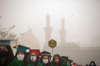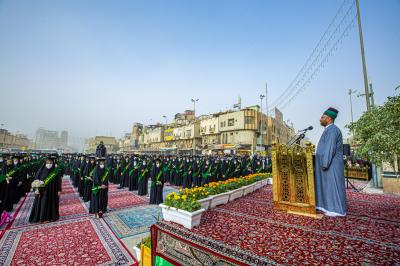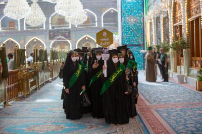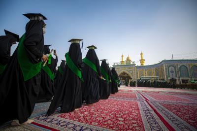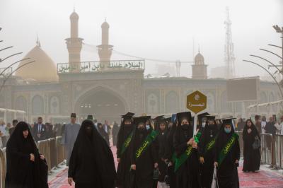 Leur serment de remise des diplômes a été prononcé devant le sanctuaire du Maître Aba al-Fadl al-Abbas (que la paix soit sur lui), en tant que chef du Département de l'éducation et de l'enseignement supérieur du sanctuaire sacré d'al-Abbas (p), le Dr Ahmed al-Kaabi, l'a lu, et ils ont répété après lui.
