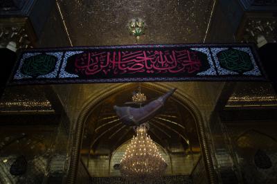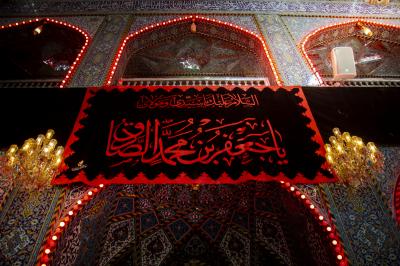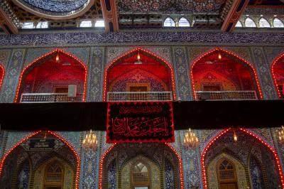 Bei dieser Gelegenheit wurde der Heilige Abbassitische Schrein, wie auch die anderen Schreine und Heiligtümer, von Trauer und Schmerz überwältigt, und an allen Wänden des Heiligtums von Aba al-Fadl al-Abbass (Friede mit ihm) wurden schwarze Banner aufgehängt und rote Lampen angezündet, wie es zum Gedenken an die Jahrestage des Martyriums der Ahl al-Bayt (Friede mit ihnen) üblich ist.