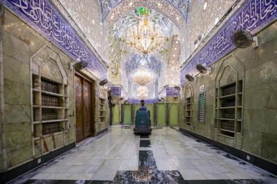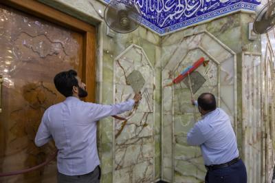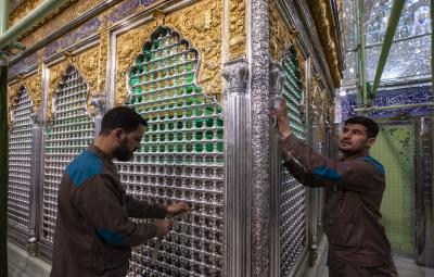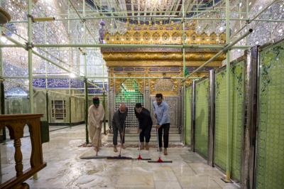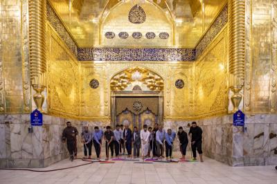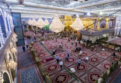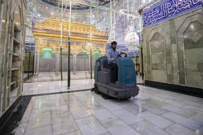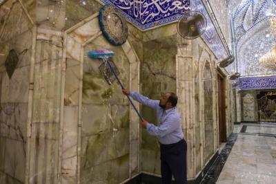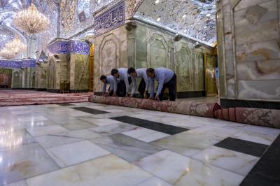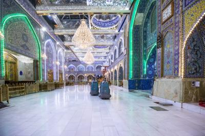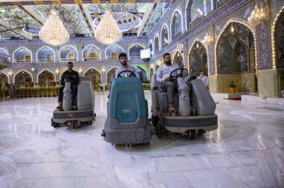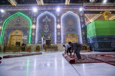 وأضاف "استخدمنا في أعمال التنظيف موادّ خاصّة تساعد في الحفاظِ على بريقِ الحرم الشريف وشبّاكه المقدّس ورونقِه، وإزالةِ أيِّ عوالقَ فيها قد تؤثِّرُ على شَكْلِها، لتُختَتَم الأعمالُ بالتعطيرِ وإعادةِ فرشِهِ بالسجّادِ حَسبَ موقعِ كلِّ سجّادةٍ، وتبعاً للقياساتِ الَّتي أُخِذتْ مُسبَقاً".