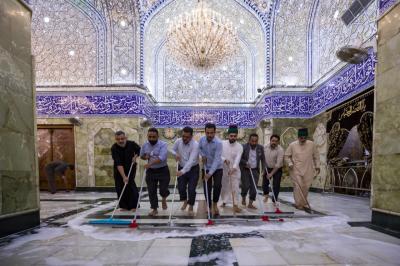 وقال معاونُ رئيس قسم الصّحن الشريف الأستاذ زين العابدين القريشي، إنَّ "الأعمال أُجرِيت بحسب كلّ مقطعٍ من مقاطعِ الصحنِ المُطهَّر، بدءاً من بوّاباته وصولاً إلى الحرم الشريف، وقد شَهِدَت في بادئ الأمر أعمال رفعِ السجّاد المفروش منذ مدّة، من ثَمَّ بُوشِرَ بأعمالِ الغسل والتنظيفِ الَّتي أُجريتْ حَسبَ كُلِّ مقطعٍ من الصَّحنِ الشَّريفِ".