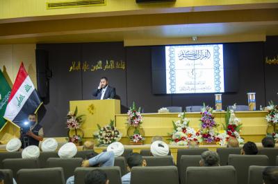Puis ce fut le tour du discours des équipes participantes, prononcé par l'étudiant Mohammed Mundher Nasser de l'Université Al-Kafeel / Faculté de médecine dentaire, à travers lequel il a présenté la nécessité de mettre en évidence l'importance de l'image poétique, en particulier pour les poètes d'Ahl al-Bayt (la paix soit avec eux), soulignant le rôle de ce concours dans l'activation de ce rôle par le sanctuaire saint d'Al-Abbas (p).