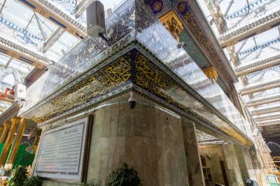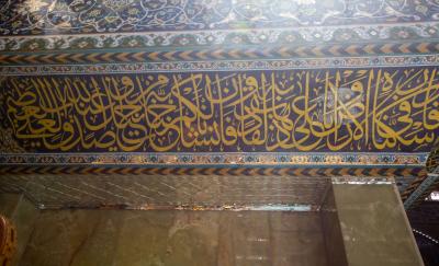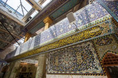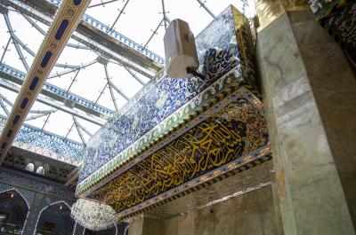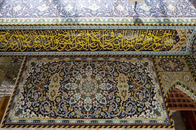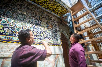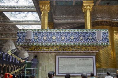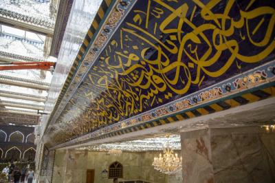وتابع "اعتلت هذه الكتائب نقوشٌ وزخارف بالكاشي الكربلائيّ المعرّق، لتشكّل هذه اللوحة مع الكتائب مزيجاً من جماليّات الخطّ العربيّ الأصيل، والزخارف الإسلاميّة النباتيّة التي ارتسمت على هذا الجدار".