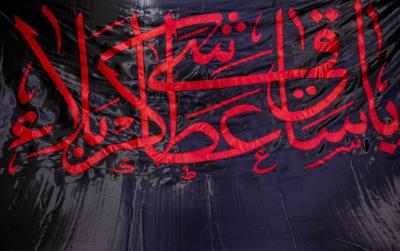 Il a poursuivi: "De chaque côté, la phrase (Oh, j'ai soif, Karbala) est écrite en rouge, et cette phrase se rapporte aux mois de Muharram et Safar uniquement, et est écrite en écriture thuluth sur une zone de 1,2 mètres et vingt centimètres, où la zone d'écriture occupe environ 2,5 mètres et un demi-mètre de la surface totale du drapeau.