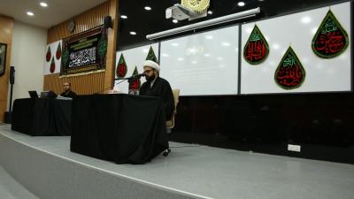 ابتُدئ مجلسُ العزاء بتلاوة آياتٍ من الذكر الحكيم بصوت القارئ الشيخ مهدي قلندر، أعقبتها محاضرةٌ ألقاها الشيخ حازم الوائلي، وتحدّث فيها عن دور الإمام السجّاد(عليه السلام) واهتمامه بكلّ ما تحتاج إليه الأمّةُ الإسلاميّة، في حياتها المعنويّة كما في حياتها المادّية، فكان الإمام بهذا العمل يعيش الهاجس الروحيّ مع الأمّة ويستشعر المسؤوليّة الكُبرى تجاهها، إذعاناً منه لحديث جدّه رسول الله(صلّى الله عليه وآله وسلّم): (من أصبَحَ ولم يهتمَّ بشؤون المسلمين فليس بمسلم)، كذلك تطرّق إلى ومضاتٍ مضيئة من السيرة العطرة لهذا الإمام الهمام، واختُتِمَ المجلس بمرثيّةٍ عزائيّة حول مصاب الشهادة الأليمة.