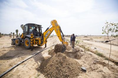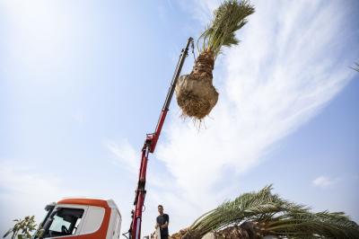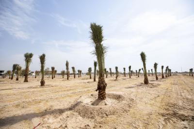 Ameer Hussein, der Leiter der Farm, sagte, dass in einer ersten Phase zweihundert Palmen unterschiedlicher Größe und Art auf einer Fläche von 12 Hektar gepflanzt wurden, und fügte hinzu: "Ihre Präsenz wird durch die Anpflanzung von Obstbäumen wie Feigen, Granatäpfeln und Zitrusfrüchten in ihrem Schatten unterstützt".