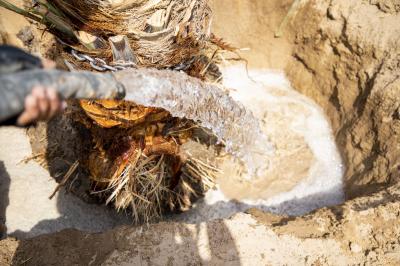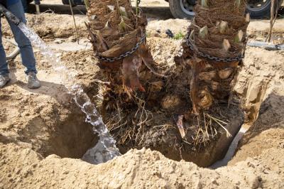 Er fügte hinzu, dass "die angebauten Sorten zwischen al-Zahdi, al-Khastawi, al-Tabarzel und al-Mutawaq variieren und die Länge dieser Palmen bis zu zwei Meter beträgt, und da der Boden der Farm sandiger Natur ist, haben wir Nährstoffe von der Firma Khair Al-Joud hinzugefügt, einschließlich Huminsäure, die den Bäumen hilft, Nahrung aufzunehmen, damit sie schneller wachsen".