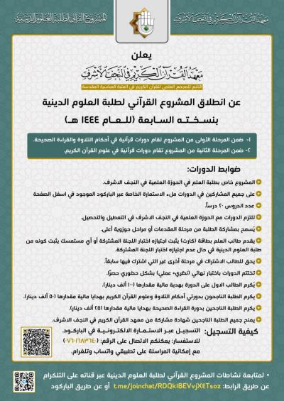 مرکز قرآن الکریم در نجف اشرف وابسته به بنیاد علمی بر این طرح نظارت دارد که در مرحله اول آن دوره های قرآنی در زمینه احکام تلاوت، قرائت صحیح و در مرحله دوم آن دوره های قرآنی در زمینه علوم قرآن کریم برگزار می شود.