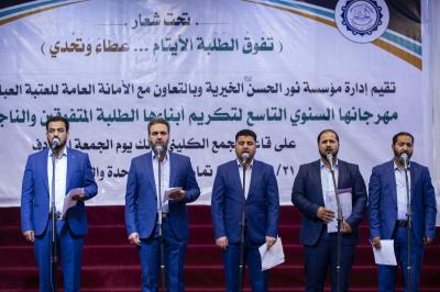 The ceremony concluded with honoring the outstanding students, who are more than 600 students, by the secretary general of the Al-Abbas's (p) holy shrine; Sayed Mustafa Mortadha Dia' uddin, and the head of the Religious Affairs Department; Sheikh Salah al-karbala'i.