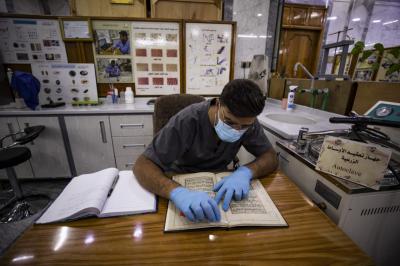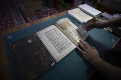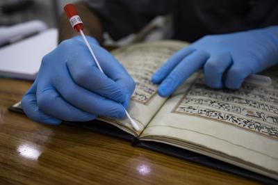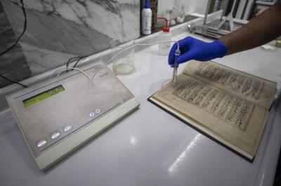 Le directeur du centre, M. Laith Lutfi, a déclaré que "le Coran se compose de six parties, et les opérations de restauration ont commencé par un examen biologique et chimique de celui-ci, et des composants des manuscrits qui contiennent de nombreuses couleurs, encres et décorations", ont été soigneusement examinés ainsi que le type de cuir et de papier utilisé pour les fabriquer."