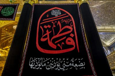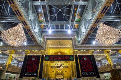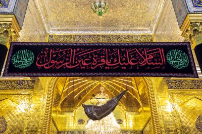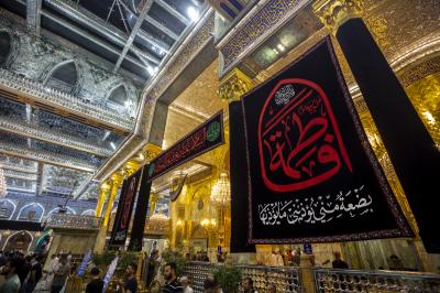 وعُلّقت في أرجاء الصحن الشريف رايات العزاء واللافتات التي خطّت عليها عبارات الحزن والمواساة.