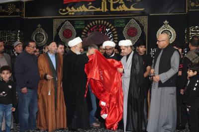 Die Fahne wurde vom Vertreter des Heiligen Abbassitischen Schreis in den Vereinigten Staaten von Amerika, Scheich Mohammed Jawad al-Salami, während der Gedenkfeier zum Jahrestag des Märtyrertodes der Heiligen Az-Zahra (Friede mit ihr) überreicht.