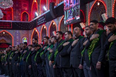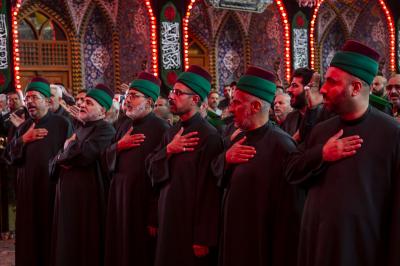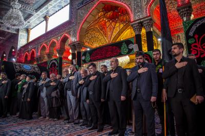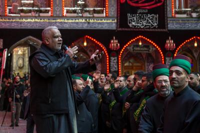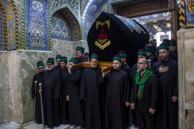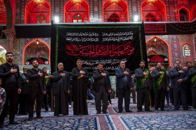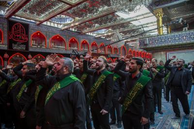 Als sie am Heiligen Husseinitischen Schrein ankamen, wurden sie von ihren Brüdern von den Dienern von Aba Abdillah Al-Hussein (Friede mit ihm) empfangen, um ihr Beileid auszudrücken, so dass sie dort in der Nähe des Schreins von Aba Abdillah Al-Hussein (Friede mit ihm) eine Kondolenzversammlung abhielten, an der die Besucher teilnahmen, die dort waren.