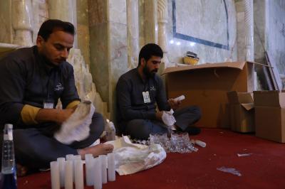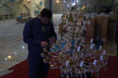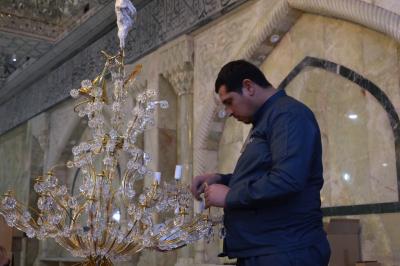 Mukaddes Hz.Abbas (Allah’ın selâmı üzerine olsun) Türbesi Esas Avlunun Bakımı Bölümü tarafından gerçekleştirilen çalışmalar ile ilgili olarak Avizeler ve Aynalar Şubesi’ne bağlı Bakım ve Montaj Birimi (az evvel adı geçen bölüme bağlı bir yapı) Sorumlusu Ali Mechul Muhammed’den bilgi aldık. Bu kapsamda Çek Cumhuriyeti menşeli Martiza türünde altın kaplama, serçe kristali takılı 32 adet yeni avizenin takıldığını belirten Muhammed; avizelerin kendilerine sökülmüş halde geldiğini ve takılması önce ustalar tarafından detaylı bir montaj süreci gerçekleştiğini paylaştı.