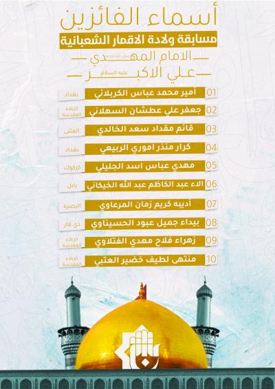 Der Heilige Schrein lud die Gewinner ein, in der Abteilung für intellektuelle und kulturelle Angelegenheiten in Ha'ir al-Mawla, Abi al-Fadl Al-Abbass (Friede mit ihm), für den Zeitraum 1. und 5. des gesegneten Monats Ramadan und von 13-18 Uhr zu kommen, wonach das Recht auf den Preis fällt.