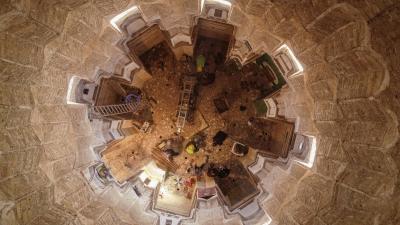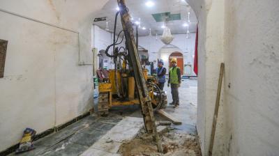 Die zweite Phase bestand in der Durchführung von Injektionsarbeiten am Standort des Minaretts Maqam unter Verwendung von salzresistentem Zement, um die Schwachstellen und Lücken zu schließen und die Fundamente des Maqam zu verstärken, nachdem ein integrierter Arbeitsplan entwickelt worden war, der die Klärung des Zwecks der Arbeiten und die Ermittlung der wichtigsten Anforderungen beinhaltete, und zwar durch die Bereitstellung von Maschinen und Ausrüstung, die für die Durchführung von Bohrinjektionsarbeiten erforderlich sind, sowie die Verarbeitung von 64 Tonnen widerstandsfähigem Zement und die Verarbeitung von Plastifizierungszusätzen von renommierten Unternehmen.