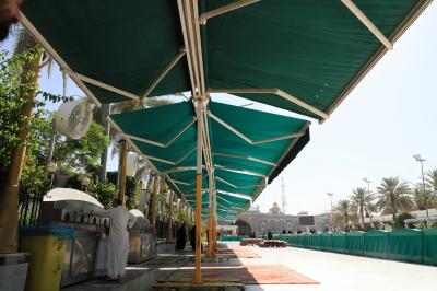 Er fügte hinzu: "Die Besucher profitieren von diesen Schirmen, indem sie sich unter ihren Schatten setzen, um die Andachtsübungen des Ziyarat zu verrichten", und wies darauf hin, "den Bereich zwischen den beiden Heiligen Schreinen mit einem Teppich auszulegen, damit möglichst viele Besucher davon profitieren.
