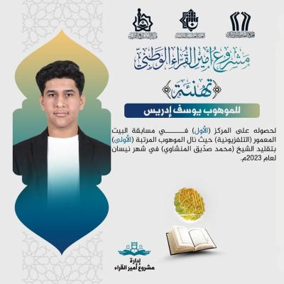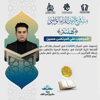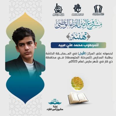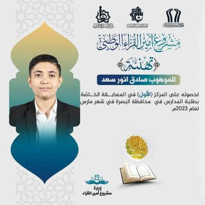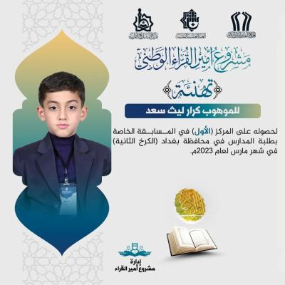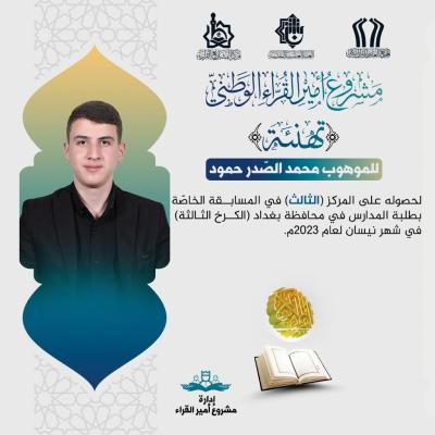 قاری محمد الصدر حمود نیز رتبه سوم را در مسابقات دانشآموزی (الکرخ الثالثه) برای حضور خود ثبت نمود.