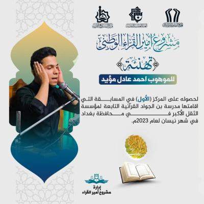 قاری احمد عادل مؤید، در مسابقاتی که مدرسه (ابن الجواد القرآنية) در بغداد برگزار کرده بود، موفق به کسب رتبه برتر شد. قاری لیث سعد، در مسابقات دانشآموزی مدارس (الکرخ الثانیه) رتبه اول را به دست آورد.