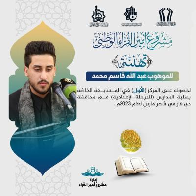 اما در استان ذي قار، قاری عبدالله قاسم، رتبه اول را در مسابقات دانشآموزی مقطع راهنمایی کسب نمود. این در حالیست که قاری محمد علی عبید در همین مسابقات در مقطع دبیرستان نفر اول شد و قاری مصطفی جواد الشعلان در مسابقات استانی جایگاه اول را از آن خود کرد.