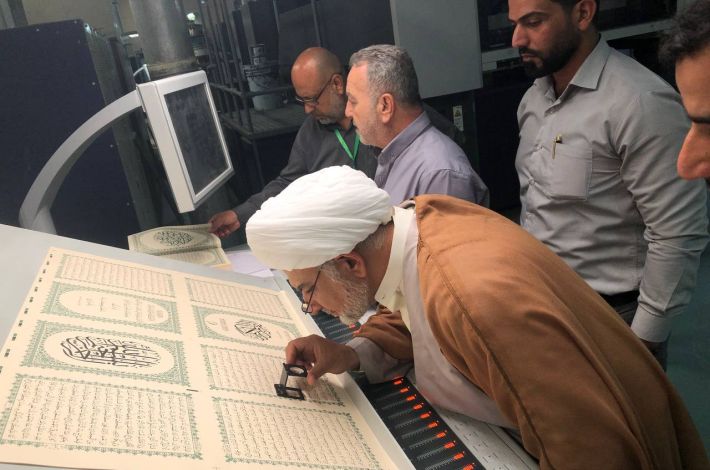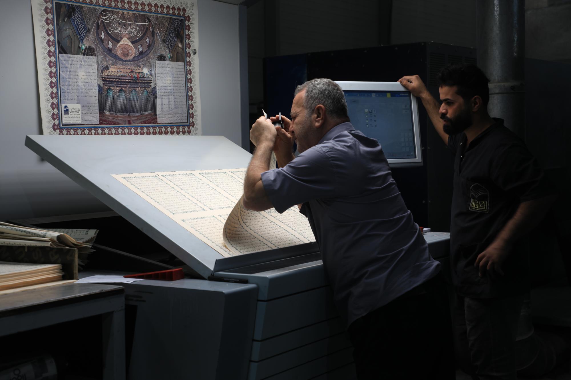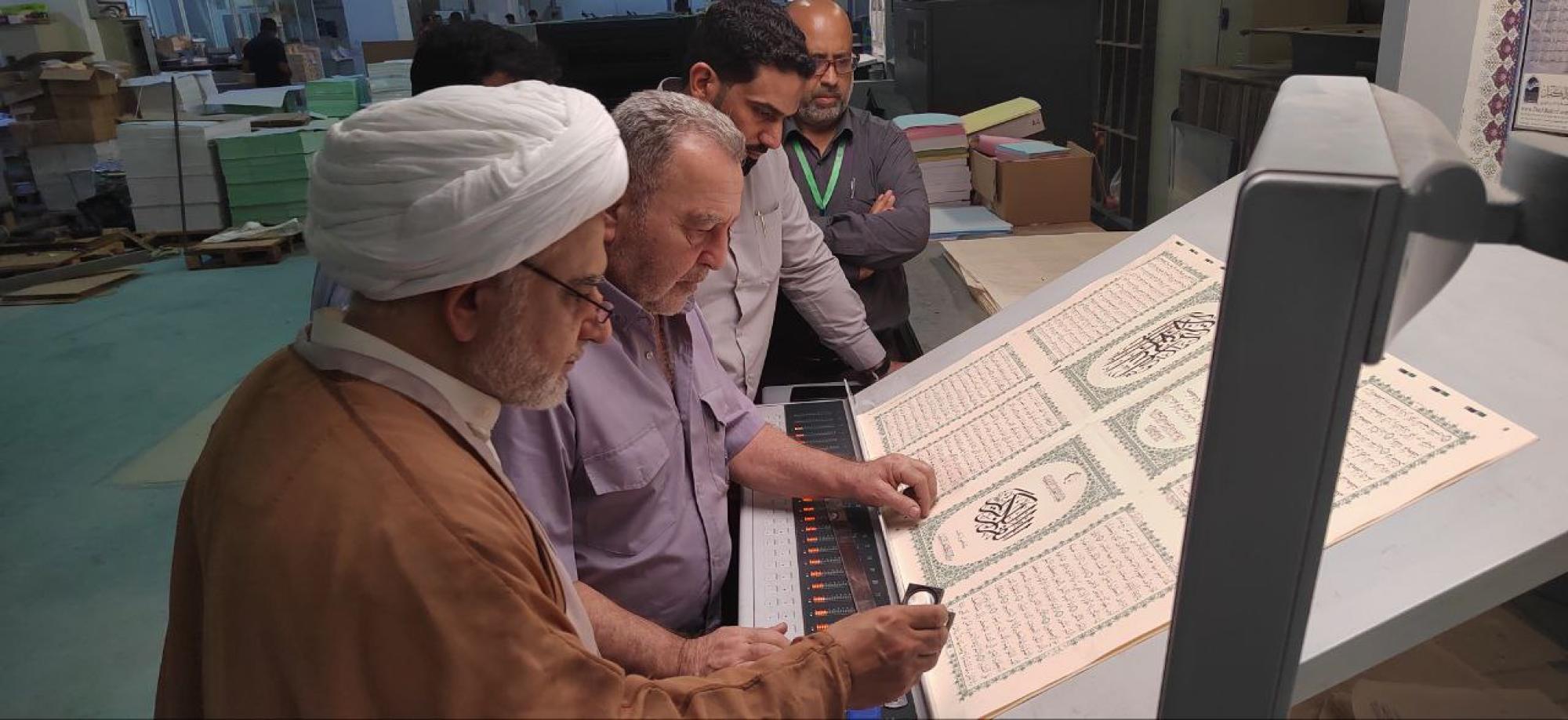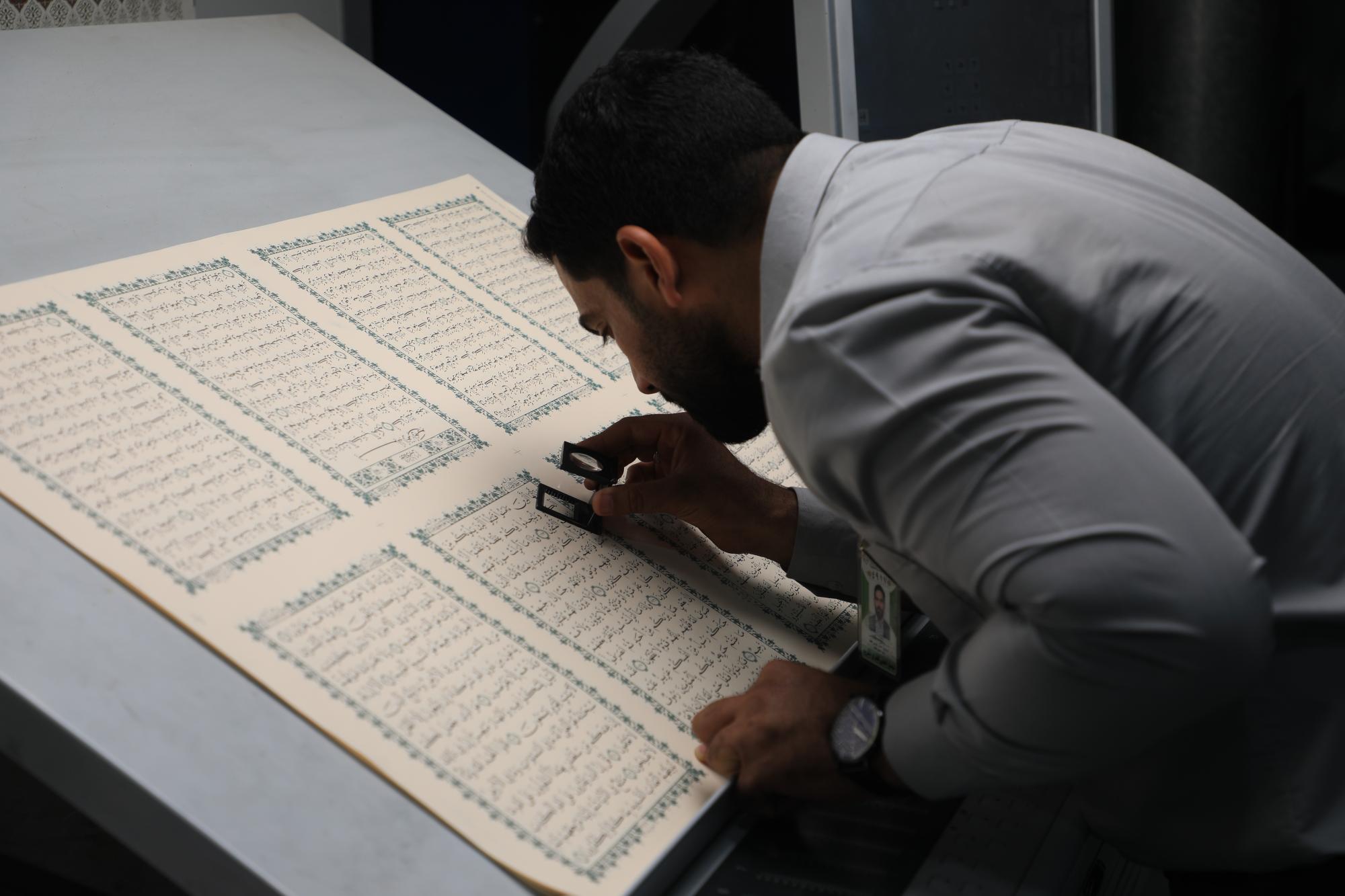 وأضاف "تستمرّ عملية الملاحظة والتدقيق في المطبعة، بوجود فريقٍ من المدقّقين مع الطبّاعين، حيث يمرّ القرآن الكريم قبل طباعته بمراحل عديدة منها عمليّة التجميع والطوي، وتُرتّب على شكل ملازم، وهذه الملازم تذهب إلى الخياطة لتعود إلى التدقيق مرّة أخرى، للتأكّد من صحّتها وسلامتها دون أيّ إشكال أو خدش أو قطع أو خطأ".