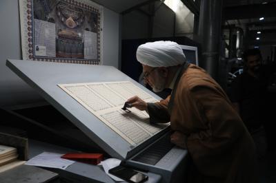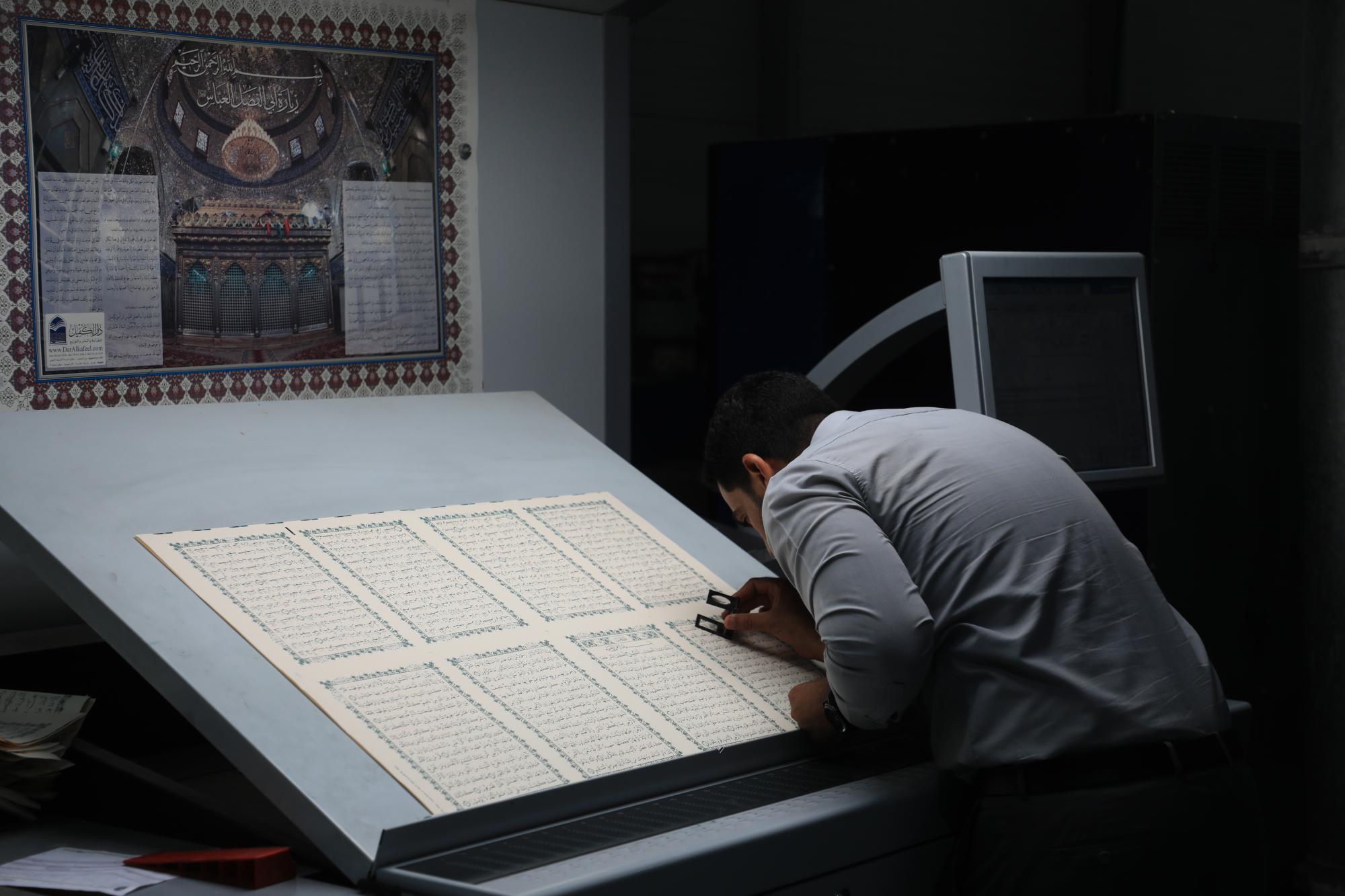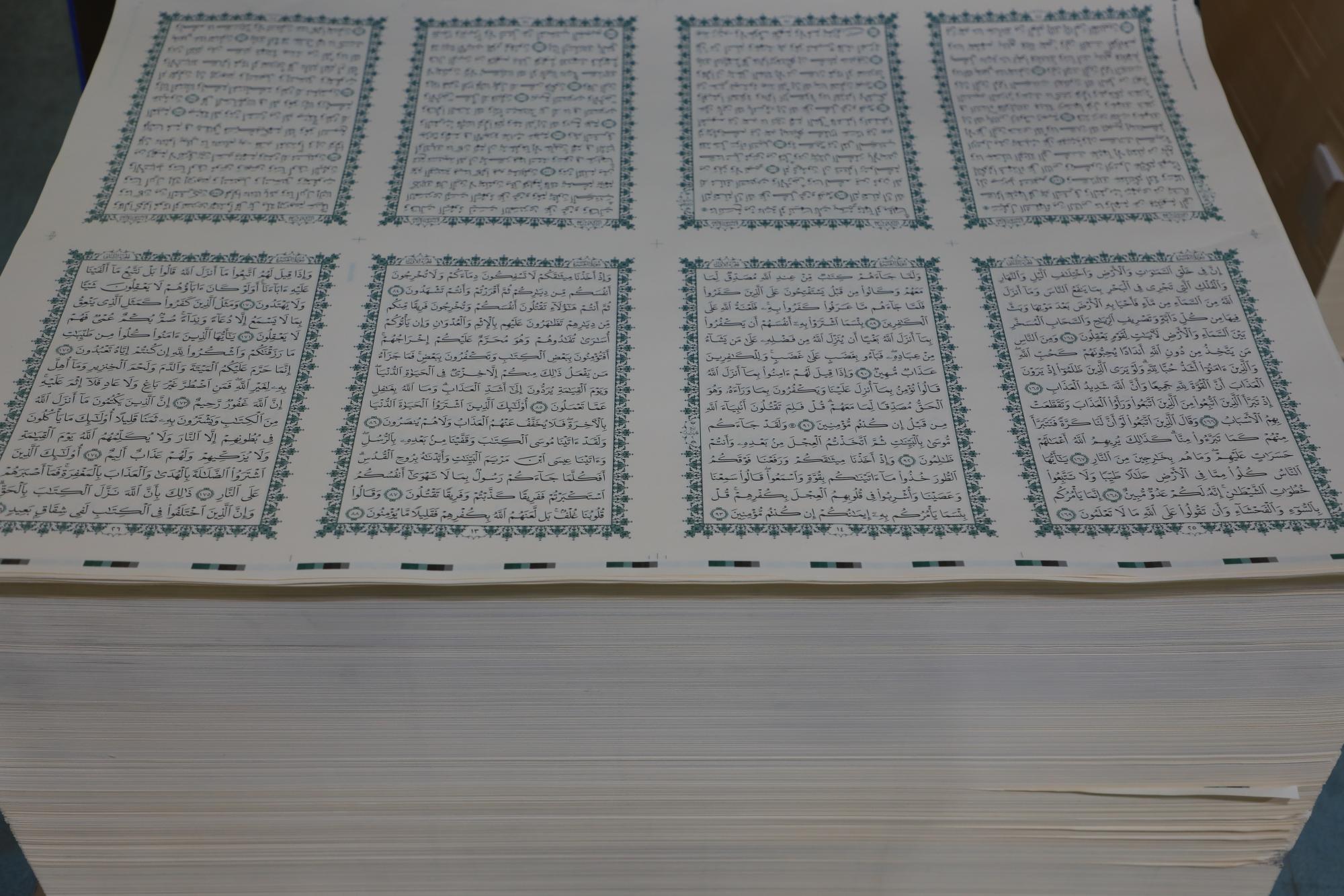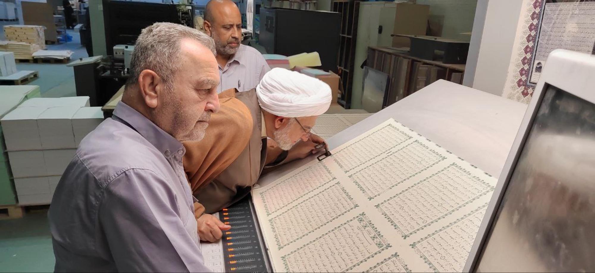 وأضاف "تستمرّ عملية الملاحظة والتدقيق في المطبعة، بوجود فريقٍ من المدقّقين مع الطبّاعين، حيث يمرّ القرآن الكريم قبل طباعته بمراحل عديدة منها عمليّة التجميع والطوي، وتُرتّب على شكل ملازم، وهذه الملازم تذهب إلى الخياطة لتعود إلى التدقيق مرّة أخرى، للتأكّد من صحّتها وسلامتها دون أيّ إشكال أو خدش أو قطع أو خطأ".