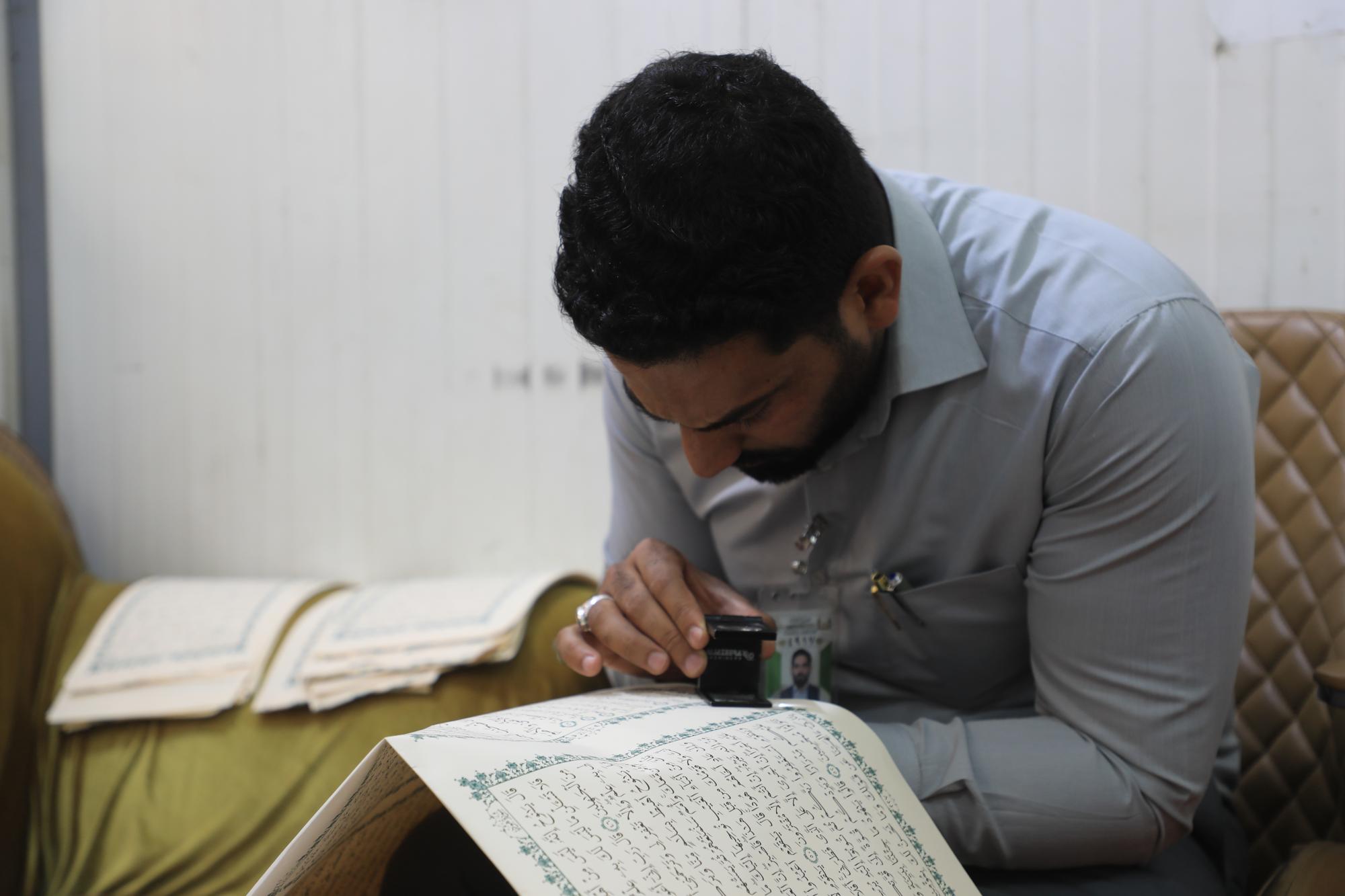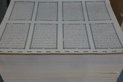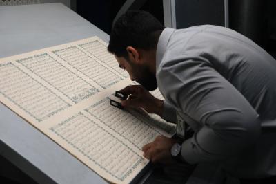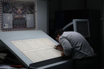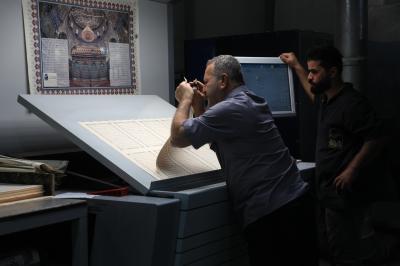 وتابع "بعد ذلك يتمّ ختم النسخة المطبوعة وتُرسل إلى التجليد، لتدقّق للمرّة الثالثة، للتأكّد من سلامتها بشكلٍ كامل عبر مراحل التدقيق المتعدّدة، بعد ذلك يوقّع عليها فريقُ المدقّقين لتبدأ بعد ذلك عمليّة الإخراج والتوزيع"، مشيراً إلى أن "عمليّتي الطباعة والتدقيق تأخذ وقتاً طويلاً وشاقّاً".